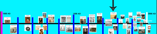 This is the past thousand years. That arrow is still showing you the birth of America, but now we can see the invention of eye glasses, the microscope, the telescope, and the compass. We see the birth of the Protestant Church just after the midway point, which means every church other than Catholic and Greek Orthodox fit on the back half of this timeline. We see the lives of Shakespeare, Genghis Khan, Marco Polo, and all of those guys the Teen Age Mutant Ninja Turtles are named after. Had america been founded at the start of the millennium, we could easily have already had more then 200 presidents. Where is the entire span of YOUR life on this timeline? How far back can you trace your family? I can trace mine to the first settlers here on the Mayflower, and that doesn’t even go back to the halfway mark at 1500 AD.