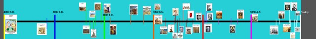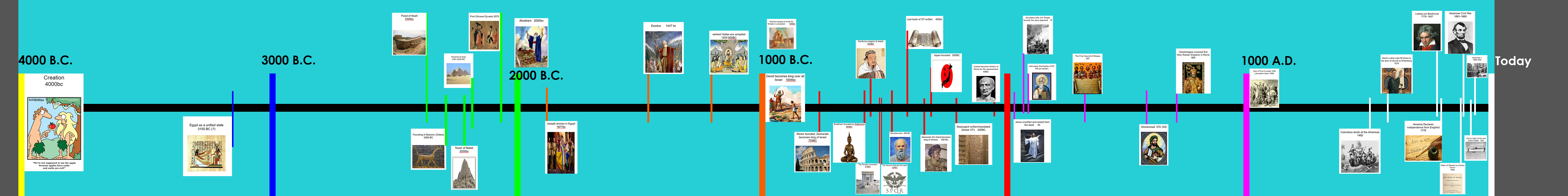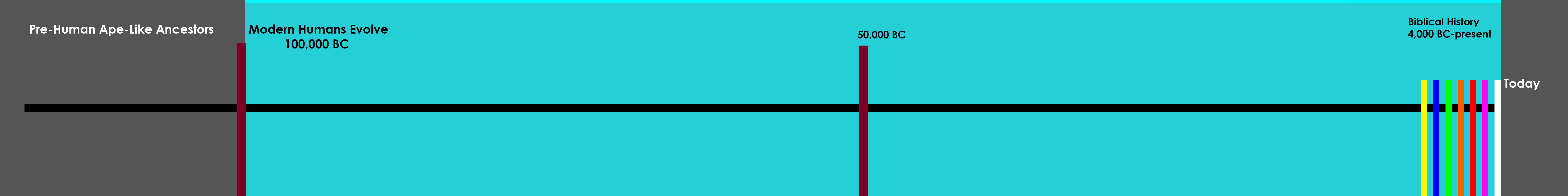 Now you’ll draw the Old Earth model. You’ll draw the creation of the first humans at the very beginning of a one foot long line. The distance after represents the 10,000 years of human history, depending who you ask. If you ask someone who accepts the deep time/evolutionary dates (as many OEC do) you will find your timeline of human history is actually 100,000 years (ten feet on our timeline) and looks like the one below. The collection of colored lines on the far right there is the 6,000 years of biblical/world history presented in the timeline above.