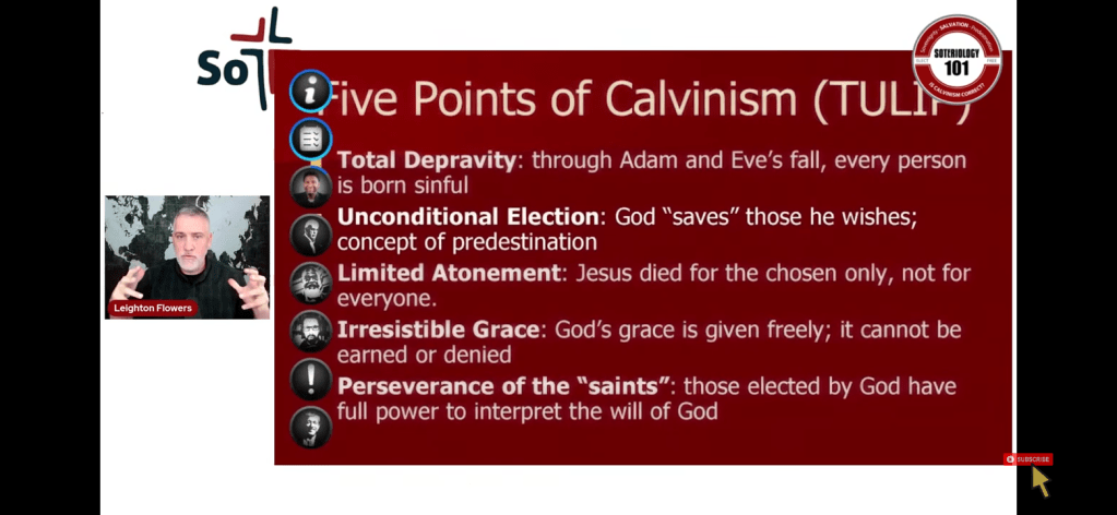 This image is a screen shot of a Soteriology 101 video about that video, that you can watch here (about 18 min in for this screen shot). This brings us to my article about Dr Flower’s video about Reformedwiki’s video about Mike and Allen’s videos about Calvinism.